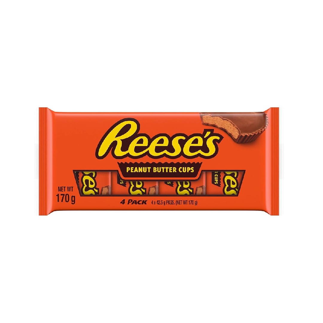 REESES 4 PEANUT BUTTER CUPS CHOCOLATE 6PACK,”Reese’s Peanut Butter Cups 6 Pack contains four classic chocolate cups per pack, featuring creamy peanut butter filling surrounded by smooth milk chocolate. Originating from the United States, Reese’s is part of the Hershey Company and is widely associated with rich peanut flavors and satisfying confectionery experiences. This product contains 0% alcohol, making it suitable for all age groups who enjoy peanut-based sweets. Ingredients typically include peanuts, sugar, cocoa butter, chocolate, non-fat milk, lactose, palm oil, salt, emulsifiers, and natural flavors. The sweet and salty contrast between peanut butter and chocolate has made Reese’s globally popular, particularly in gift packs and seasonal assortments. The 6 pack format is ideal for sharing or portion-controlled snacking at home, school, or during travel. These cups can also be used in milkshakes, dessert toppings, and baking due to their melt-friendly composition. Alcohol Percentage: 0%. Origin: USA.”